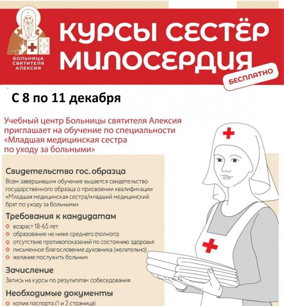 Обучение проведут высококлассные специалисты больницы святителя Алексия города Москвы, обладающие огромным опытом помощи военным и восстановления здоровья пациентов. По окончании курса выдается свидетельство государственного образца о присвоении квалификации «Младшая медицинская сестра по уходу за больными».